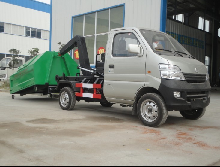 長安車廂可卸式垃圾車:新款駕駛室,2.5米軸距,長安JL4600Q4汽油發動機(國四)53馬力,5檔變速箱,前盤后鼓剎車,165真空胎。