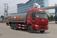 運送介質品名:稀鹽酸,介質密度:1050千克/立方米;類項號:2.3;罐體有效容積14.4立方米;整車長(mm):10225, 對應車高(mm):3454(高頂),對應罐體外形尺寸(長×長軸×短軸)(mm):7400×2100×1300,對應軸距(mm):4800+1350。整車長(mm):9725, 對應車高 (mm):3170 (平頂),對應罐體外形尺寸(長×長軸×短軸)(mm):6700×2180×1380, 對應軸距(mm): 4300+1350。防護材料:Q235A碳鋼,連接方式:左右側面及后下部防護均采用焊接連接,后部防護斷面尺寸(mm):100×50,后部防護離地高度(mm):510, 隨底盤選裝平頂駕駛室,額定載質量14500kg對應準乘3人,額定載質量14565kg對應準乘2人。前輪裝配盤式制動器,裝配限速裝置,限速79km/h,ABS系統生產廠家1:浙江萬安科技股份有限公司,型號:VIE ABS-Ⅱ,ABS系統生產廠家2:WABCO,型號:4460043200, 安裝帶有衛星定位功能的行駛記錄儀。僅采用BF6M1013-24E4發動機,油耗值(L/100km):38.13。僅采用底盤子午線輪胎(10.00R20,11.00R20)和帶ABS的底盤。