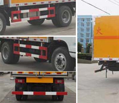 選裝右側箱體不開門, 廂體顏色可變化, 廂體頂部封閉, 不可開啟。隨底盤選裝駕駛室. 安裝限速裝置, 限速80km/h。該車安裝帶有衛星定位功能的行駛記錄儀。僅采用前盤制動器和安裝ABS以及前置消聲器的底盤。僅采用子午線輪胎。ABS型號為3631010-C2000, 生產廠家為東科克諾爾商用車制動系統(十堰)有限公司。運輸具有獨立容器包裝的易燃氣體:液化石油氣、壓縮甲烷或甲烷含量高的壓縮天然氣, 乙炔, 乙烷, 丁烷, 丁烯, 甲烷, 丙烯, 二甲醚, 壓縮氫; 運輸具有獨立容器包裝的非易燃無毒氣體:二氧化碳, 壓縮氧(氮, 空氣, 氦, 氬, 氖), 運送危險品類項號:2.1, 2.2; 防護材料:Q235A碳鋼, 連接方式:左右側面及后下部防護均采用焊接連接, 后部防護斷面尺寸(mm):100×50, 后部防護離地高度(mm):510.發動機CY4BK151, 4DX23-140E5, CY4SK251, YC4S150-50分別對應的油耗值為:23.8, 23.8, 23.8, 24.4.整車長/軸距/后懸/高對應關系為(mm):7450/4200/2000/3400, 7050/3950/1850/3200, 7050/3800/2000/3200.