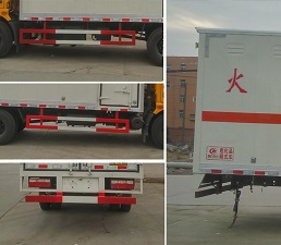 該車(chē)適用于運(yùn)輸危險(xiǎn)品。選裝右側(cè)箱體不開(kāi)門(mén), 車(chē)廂頂部不可開(kāi)啟。選裝不開(kāi)側(cè)門(mén)時(shí)對(duì)應(yīng)的寬度為2400mm。選裝側(cè)門(mén)型式及位置, 廂體顏色可變化, 文字噴涂位置可變化。安裝限速裝置, 限速80km/h。安全裝置為導(dǎo)靜電帶, 用于防止靜電。該車(chē)安裝帶有衛(wèi)星定位功能的行駛記錄儀, 僅采用前盤(pán)制動(dòng)器和安裝ABS的底盤(pán), 排氣管前置, 僅采用子午線(xiàn)輪胎。該車(chē)主要用于運(yùn)輸具有獨(dú)立容器(瓶)包裝的氨溶液(氨水), 甲醛溶液, 除銹磷化液(除銹磷化處理劑), 電池, 電池液, 木餾油, 類(lèi)項(xiàng)號(hào):8。側(cè)防護(hù)和后防護(hù)裝置材料材質(zhì)為Q235A碳鋼, 側(cè)防護(hù)與箱體底部焊接連接, 后防護(hù)裝置與車(chē)架采用焊接連接。后防護(hù)截面尺寸(mm):100×50, 離地高度為510mm。僅采用發(fā)動(dòng)機(jī)CY4SK251對(duì)應(yīng)的油耗值為:23.6。ABS系統(tǒng)生產(chǎn)廠(chǎng)家及型號(hào) :襄陽(yáng)東風(fēng)隆誠(chéng)機(jī)械有限責(zé)任公司, ABS/ASR-24V-4S/4M。