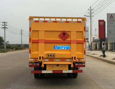 該車適用于運輸危險品, 主要用于運輸具有獨立容器(瓶)包裝的液化石油氣, 丁烷, 乙炔, 乙烷, 丙烷, 丁烯, 打火機或打火機加油器, 二氧化碳, 壓縮氧(氮, 空氣, 氦, 氬, 氖); 壓縮煤氣, 類項號:2.1, 2.2。該車運輸的介質為2.1項易燃氣體時, 車輛采用”易燃氣體”標識牌, 運輸的介質為2.2項非易燃無毒氣體時, 車輛采用”不燃氣體”標識牌。選裝后部液壓尾板, 箱欄板內長(mm):3800, 貨欄顏色可變化, 文字噴涂位置可變化。后部液壓尾板收起狀態長度是250mm。 采用發動機型號CY4BK551, YC4FA115-50, D28D11-5DA, 對應油耗值分別為油耗 (L/100km):12.4, 12.6, 12.6。防護材料:Q235A碳鋼, 連接方式:左右側面及后下部防護均采用焊接連接, 后部防護斷面尺寸(mm):100×50, 后部防護離地高度(mm):350, 該車安裝帶有衛星定位功能的行駛記錄儀, 僅采用前盤制動器和安裝ABS以及前置消聲器的底盤, 采用子午線輪胎, 安裝限速裝置, 限速80km/h, 專用裝置為固定用卡槽。車輛前輪距僅采用1503mm。ABS廠家及型號:襄陽東風隆誠機械有限責任公司/ABS/ASR-24V-4S/4M。