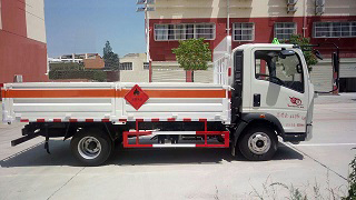 該車適用于運輸危險品, 主要用于運輸具有獨立容器(瓶)包裝的液化石油氣, 丁烷, 乙炔, 乙烷, 丙烷, 丁烯, 打火機或打火機加油器, 二氧化碳, 壓縮氧(氮, 空氣, 氦, 氬, 氖), 類項號:2.1, 2.2。該車運輸的介質為2.1項易燃氣體時, 車輛采用”易燃氣體”標識牌, 運輸的介質為2.2項非易燃無毒氣體時, 車輛采用”不燃氣體”標識牌。貨欄顏色可變化, 文字噴涂位置可變化, 選裝無柵欄。采用發動機型號YN27CRE1, YN38CRE1, CY4BK151, JE493ZLQ5, D25TCIE1, D25TCIE3對應油耗值分別為油耗 (L/100km):11.2, 11.6, 12.0, 11.4, 12.0, 12.0。整車長/軸距/后懸對應關系為(mm):5995/3280/1555, 5995/3160/1675.防護材料:Q235A碳鋼, 連接方式:左右側面及后下部防護均采用焊接連接, 后部防護斷面尺寸(mm):100×50, 后部防護離地高度(mm):520, 該車安裝帶有衛星定位功能的行駛記錄儀, 僅采用前盤制動器和安裝ABS以及前置消聲器的底盤, 采用子午線輪胎, 安裝限速裝置, 限速79km/h, 專用裝置為固定用卡槽。ABS系統型號為XH-KQ4S4M-E01, 生產企業為廣州市西合汽車電子裝備有限公司。