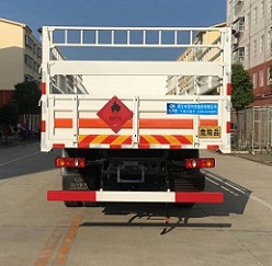 該車適用于運輸危險品, 主要用于運輸具有獨立容器(瓶)包裝的液化石油氣, 丁烷, 乙炔, 乙烷, 丙烷, 丁烯, 打火機或打火機加油器, 二氧化碳, 壓縮氧(氮, 空氣, 氦, 氬, 氖), 類項號:2.1, 2.2。該車運輸的介質為2.1項易燃氣體時, 車輛采用”易燃氣體”標識牌, 運輸的介質為2.2項非易燃無毒氣體時, 車輛采用”不燃氣體”標識牌。貨欄顏色可變化, 文字噴涂位置可變化。可選裝后部液壓尾板, 后部液壓尾板收起狀態長度是250mm。整車長/軸距/后懸對應關系為(mm):9000/5000/2570, 8600/4700/2470, 8400/4500/2470。發動機ISD210 50, ISB210 50, ISB190 50對應的油耗值分別為:29.0, 29.1, 29.1。防護材料:Q235A碳鋼, 連接方式:左右側面及后下部防護均采用焊接連接, 后部防護斷面尺寸(mm):100×40, 后部防護離地高度(mm):490。該車安裝帶有衛星定位功能的行駛記錄儀, 僅采用前盤制動器和安裝ABS以及前置消聲器的底盤, 采用子午線輪胎, 安裝限速裝置, 限速80km/h。專用裝置為固定用卡槽。選裝無柵欄。安裝ABS, ABS型號:3631010-C2000, 4460046440; 生產廠家:東科克諾爾商用車制動系統(十堰)有限公司, 威伯科汽車控制系統(中國)有限公司。