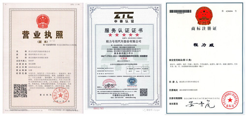 程力專用汽車股份有限公司是中國知名國林綠化、石油化工、市政環衛、壓力容器專用汽車制造商!湖北程力公司技術雄厚,檢測手段完備,擁有國內外先進的生產設備,產品質量穩定,經營方式靈活,程力公司已率先全面通過ISO9001-2000國際質量體系認證,產品全部通過3 C國際強制產品認證,并通過出口產品的各項認證。程力公司服務宗旨是:以質量求生存、信譽是保證。誠信待人、靈活經營、高質低價、講究效率。以下是程力專用汽車股份有限公司資質證書!