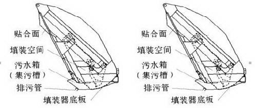 湖北程力壓縮式垃圾車對污水的集污能力體現在污水箱的設計上,通常有兩種辦法:一種是將污水箱設在填裝器前下部,可較好利用壓縮式垃圾車填裝器與廂體下部之間的空間,還可減小車輛后懸,增大離去角,但污水箱容積小,擴容潛力也小,如圖1;另一種是將壓縮式垃圾車污水箱設在填裝器底板下,放棄利用填裝器與廂體下部之間的空間,同時增大車輛了后懸,減小了離去角,污水箱容積大,擴容潛力也大,如圖。