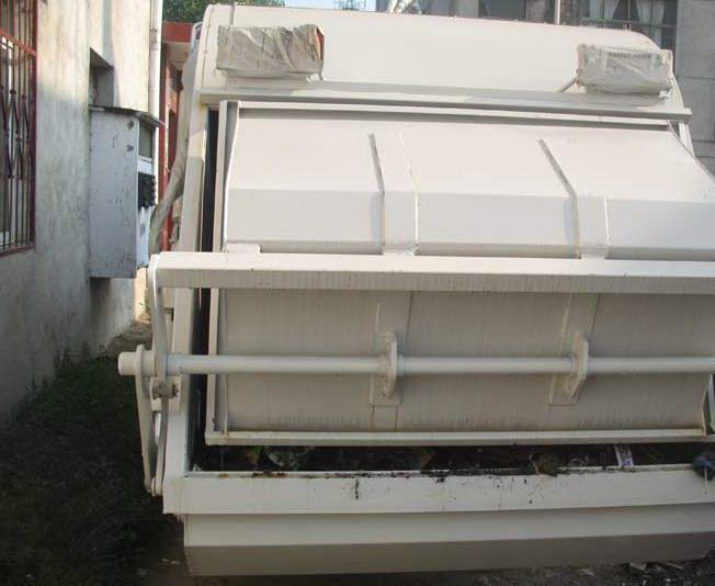 壓縮式垃圾車操作第三步,液壓機(jī)構(gòu)刮起垃圾進(jìn)入垃圾主壓廂體,主壓機(jī)構(gòu)再垃圾壓成塊