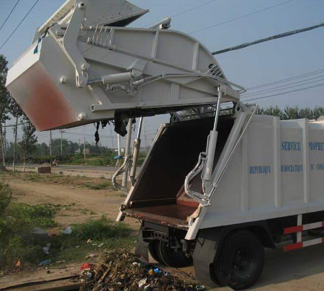 壓縮式垃圾車操作第二步,通過垃圾斗后翻轉(zhuǎn)機(jī)構(gòu)將垃圾倒入壓縮口