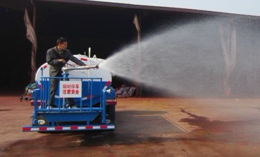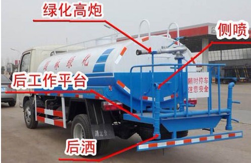 多功能灑水車帶前沖、后灑、帶側噴、帶后工作平臺。灑水車后工作平臺上安裝綠化灑水高炮。高炮可360°旋轉,可連續調成直沖狀、大雨、小雨、毛毛雨、霧狀等多種形態,并配備專用大功率灑水泵,帶消防接頭,帶自流閥,帶自吸功能。灑水車垂直吸程≥6米,灑水寬度≥14米,高炮射程≥28米。