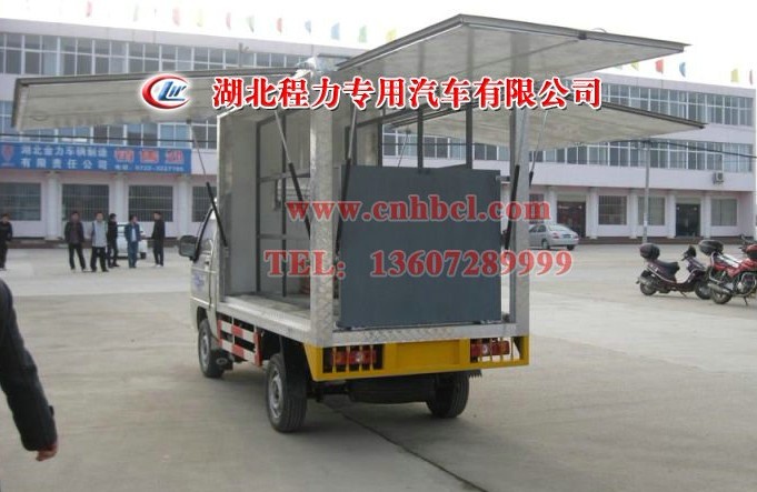 流動(dòng)售貨車是在車廂的側(cè)翼上安裝有能夠伸縮的空氣彈簧,使側(cè)翼可以繞鉸鏈向上旋轉(zhuǎn)85°,成為能遮陽(yáng)擋雨的頂棚。在車廂底板的兩側(cè)安裝有可拆卸的貨架,在側(cè)翼內(nèi)部的中間位置安裝有照明燈,使工作人員的售貨工作空間大,而且可以在夜間工作,便于貨物儲(chǔ)存和搬運(yùn),操作既方便又安全。