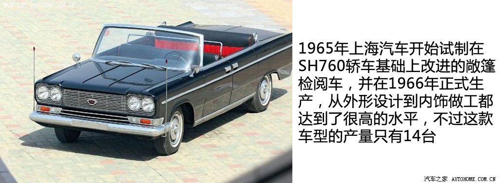 在第一臺上海SH760誕生以后,1965年上海汽車開始試制在SH760轎車基礎上改進的敞篷檢閱車,并在1966年正式生產,這款車型從外形設計到內飾做工都達到了很高的水平。無奈此時文化大革命爆發,幾乎斷送了它的生命,到1971年停產時總共只生產了14輛,也沒有真正廣泛的投入到檢閱等活動中去。可以說,上海檢閱車代表了當時上海汽車制造的最高水平,但是因為政治因素的影響,它的生命周期還沒有正式開始就結束了。
