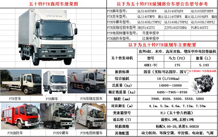 加強型中卡系列-------FTR 系列------- 底盤型號以QL1140 /QL1160 打頭,FTR國三車通用4HK1-TC五十鈴發動機,FTR國四車通用4HK1-TCG40五十鈴發動機,該級別車全部為排半駕駛室,有五種軸距,慶鈴本廠有63款公告型號。