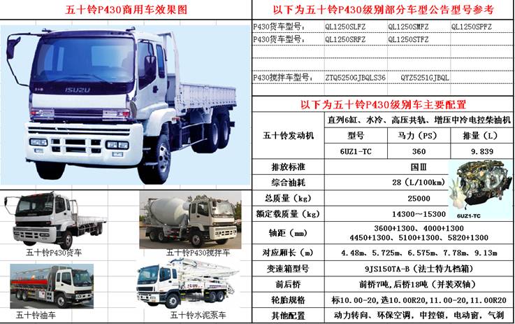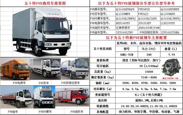 接著是五十鈴單橋重卡-------新FVR系列--------底盤型號以QL1150/QL1160打頭,通用240馬力6HK1-TCN五十鈴發動機,五種軸距。(原來FVR系列260馬力6HK1-TC 發動機車型處于限產狀態需打報告生產)