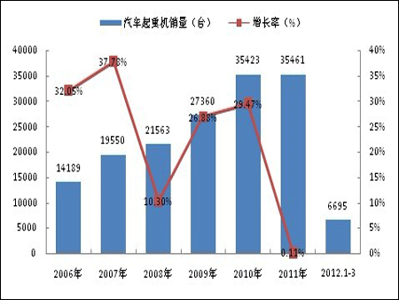 2006年-2012年1-3月我國汽車起重機總銷量及增長率