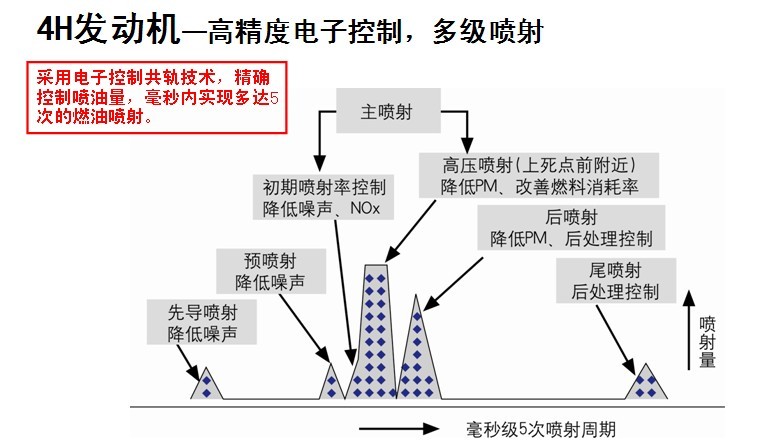 ■ 先導噴射,降噪聲;        ■ 改善燃燒率,降低油耗;          ■ 尾噴射,降排放。