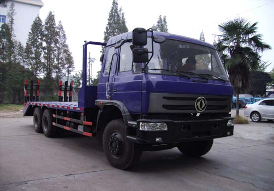 東風153單橋平板運輸車整車外形尺寸:9000×2500×2850.平頂駕駛室帶天窗豪華駕駛室,可選擇康明斯170馬力或玉柴160馬力發動機,帶增壓,6檔變速箱,匹配9.00-20或10.00-20輪胎,板長6.6米,爬梯2.2米。 | ||