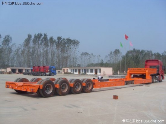 載貨部位的底板為平板結構且無欄板的半掛車,后三橋的凹梁結構也叫高低高,據(jù)說下圖中的這臺車重14噸,保拉100噸集中載荷,梁山某大廠出的。