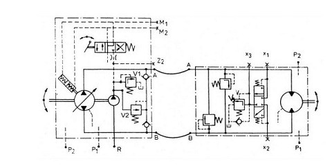 液壓泵把機械能轉換成液壓能傳送到馬達上,馬達又把液壓能轉換為機械能,最終完成功率傳遞。液壓傳動系統可以無級控制速度和方向,操作者可用一個手柄完全控制系統,進行啟動、停止、正轉或反轉,該手柄控制泵斜盤傾角。