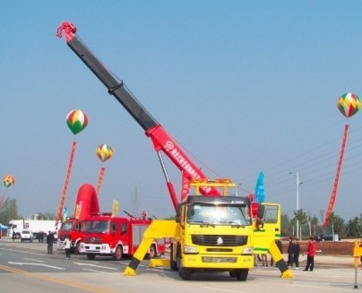 5、抽出旋轉吊座止動銷,旋轉清障車吊臂至被吊車方向,伸長吊臂使吊臂最頂端處于被吊車重心(估計)的鉛垂上方,放下鋼纜繩準備吊掛被吊車。吊掛前及進行中要接好接頭,不允許鋼纜絞纏。操作收縮鋼纜高度,保持被吊物平衡、勻速上升以防止側翻,在事故車起吊至一定高度時,將旋轉吊臂至空地放下。在整個起吊過程中,不允許吊臂伸縮。在旋轉過程中,要密切注意主車撐地支腿有無下陷狀況,發現明顯下陷時應立即停止運作。