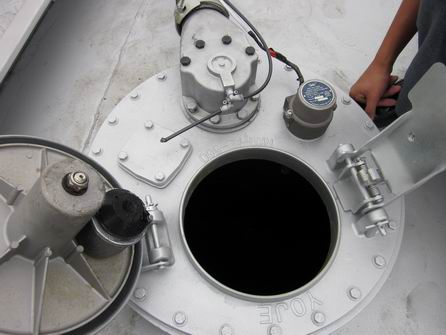 上圖是鋁合金歐標罐口,又稱人孔蓋,安裝于油罐頂部,具有內置呼吸閥和緊急排氣功能,并可在人孔蓋上安裝油氣回收閥、量油孔、防溢流探桿等,防溢流傳感系統在裝油的過程中,當液面到達探測位置時,傳感系統將自動報警,從而停止裝油。內置呼吸閥使油罐在運油過程中內部壓力保持穩定,與外部壓力達到平衡,其傾倒防止溢流的設計使油罐車在發生意外的情況下保持密封,緊急排氣裝置在罐內壓力急劇升高的情況下,將自動打開,釋放罐內壓力,從而防止事故的發生,大大提高運油的安全性。