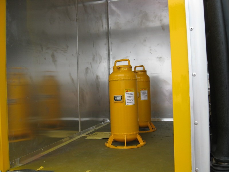 出入物口直徑為12公分、最大外徑30公分、 內高40公分,重量43kg,可容納100發電雷管