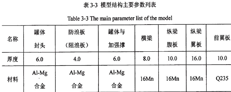 油罐車罐體與車架進行有限 元建模,其主體結構由幾節罐體依次焊接而成,端部焊接兩扁平封頭封閉罐體。罐體 總成基本參數如表3-3所示。