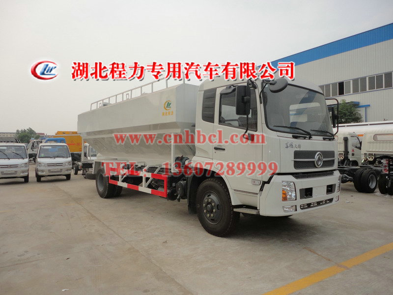 “程力威”牌系列散裝飼料運輸車主要特點有:罐體裝料分倉可以同時裝卸2-3種不同的飼料,電壓絞龍卸料節省人力與時間,裝、卸料方便,外型美觀、方便、實用等,在同類產品中處于領先地位。
