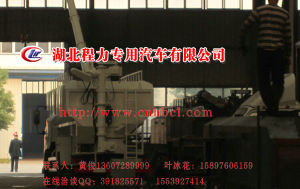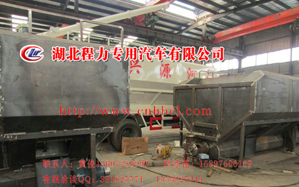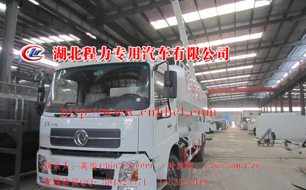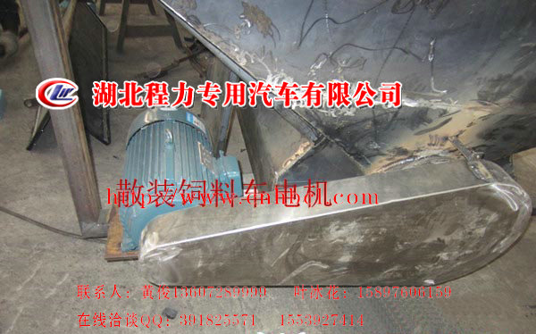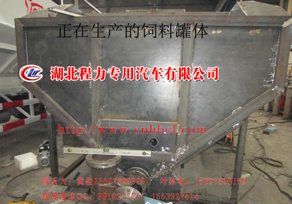 散裝飼料車的飼料罐架設在卡車的底盤上,專用設施由罐體總成、輸送系統(水平卸料系統、垂直卸料系統以及活動卸料系統組成)、散裝飼料車罐,液壓系統(高壓油泵經管路與分配閥連接該閥的三個輸出端分別是轉角液壓馬達、升降油缸以及串聯在一起的水平卸料、垂直卸料、活動卸料液壓馬達)、散裝飼料車罐電動系統、氣動分倉機構等組成。在罐體底部設有閘門,在閘門下面裝有水平螺旋輸送器(俗稱水平攪籠),由取力器由汽車變速箱輸出動力驅動,再傳動高壓油泵以驅動液壓系統,散裝飼料車罐,液壓馬達通過傳動裝置帶動水平螺旋輸送器的葉片軸及葉片旋轉,經活動輸送系統(俗稱活動攪籠)以將飼料輸出。車頂平置的一根活動卸料絞龍可自由回轉和抬升,運輸時頂部的螺旋管平臥在罐頂;卸料時則抬起,散裝飼料車罐使管端的出料口與畜禽飼養場貯料罐頂部的進料門相接、對準,完成卸料。湖北程力專用汽車有限公司新研發、生產的散裝飼料車,又名散裝飼料運輸車。結構簡單、性能可靠、輸送量大、操控方便、機動性強、對物料無污染等特點,廣泛應用于各大中小型養殖企業的飼料的運輸。公司從開發設計、生產加工、出廠檢驗、安裝調試、售后服務都有一套科學嚴密的管理程序。