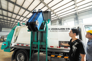 工作人員在演示餐廚垃圾車自動裝卸操作