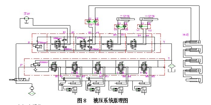 起運車工作部分的動作,包括變幅,仲縮,回轉及支腿升降幾個機構的動作由組合操縱閥來控制,液壓系統工作原理見圖8