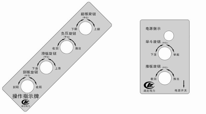 步驟1.旋轉翻桶(板)操作旋鈕至左下翻位,使翻桶(板)機構放下,松開旋鈕回中位,然后旋轉刮板操作旋鈕至右收起位,刮板收起,松開旋鈕回中位,準備開始掛桶。如圖: