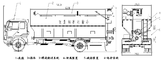 電動式散裝飼料運輸車 主體 結構 AKL5160ZSL型散裝飼料運輸車由底盤、箱 體、螺旋輸送系統、電動控制系統、旋轉裝