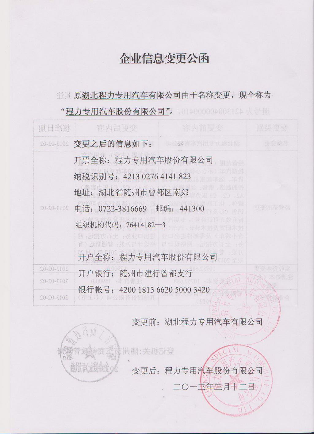 企業信息變更公函