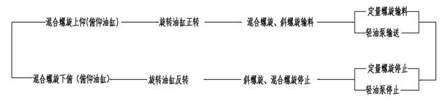 系統(tǒng)組成:輕油泵馬達(dá)、定量螺旋、斜螺旋、混合螺旋、旋轉(zhuǎn)油缸、俯仰油缸。 動作順序: 具體參數(shù): 輕油泵馬達(dá):n=500~1500rpm, 功率:1.1kw(要正反轉(zhuǎn)) 定量螺旋:n=25~70rpm,功率:3kw; 斜螺旋:n=100rpm,功率:5.5kw; 混合螺旋:n=100rpm,功率:3kw; 旋轉(zhuǎn)油缸:180°旋轉(zhuǎn),功率1.1kw,載重約1000kg; 俯仰油缸:行程:約700mm,舉升重量約1500kg。