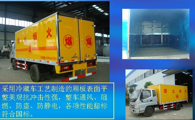 爆破器材運輸車將全金屬整體骨架特制廂體通過U型螺栓連接安裝在汽車二類底盤上。廂體分頂板、側(cè)板、前板、底板、底架(副車架)、門框、后門總成幾大部分,為分片焊接結(jié)構(gòu),各板塊骨架采用優(yōu)質(zhì)矩形鋼管焊接而成,邊框最小采用50×30(mm)矩形鋼管,橫撐最小采用38×25(mm)矩形鋼管,既充分滿足了廂體強度要求,又降低了廂體自重,提高整車裝載質(zhì)量。