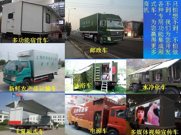 舞臺車 多功能宿營車 郵政車 新鮮農產品運輸車 沐浴車 水凈化車 飛翼廂式車 電源車 多媒體視頻宣傳車展示