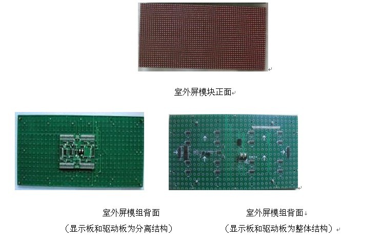 上圖為16x8(2)的室外屏模組。加了防水結構用于全戶外,我們可以看到塑料殼體,最右側是它的整個結構刨圖:顯示板上插的是燈珠、背板上是顯示驅動電路,這是分體結構的,也有的是將顯示板和顯示驅動電路做在一塊電路板上的整體結構的,下面的兩個圖我們可以看到區別。面板、后殼其實是一個塑料罩殼,面板上對應燈珠位置開有孔,以使燈珠漏出頭,后殼上有用于安裝的螺絲孔或磁柱,使模塊便于組裝。模塊的前面灌有顯示屏專用的防水膠。