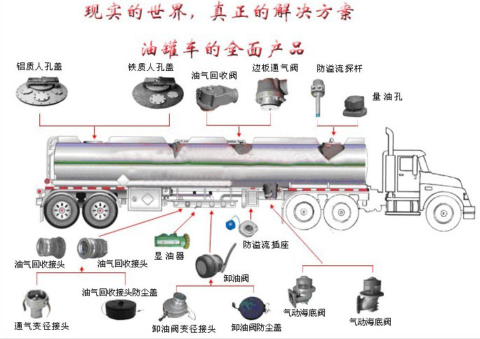 隨著國家工業化步伐的加快,石油產品需求量日趨量增加,對成品油運輸罐車的安全環保性能的要求也不斷提高,為確保油罐車在運輸和裝卸過程中的安全和環保要求,本公司引進國外先進的技術而自行研制,開發的油罐車配套的系列產品。其技術先進、性能安全可靠,安裝使用方便。 油罐車整車的配套部件基本可分:油氣回收閥、邊板通氣閥、放溢流探桿、量油孔、油氣回收接頭、顯油器、放溢流插座、卸油閥、通氣變徑接頭、油氣回收街頭防塵蓋、卸油閥變徑接頭、卸油閥防塵蓋、氣動海底閥等。