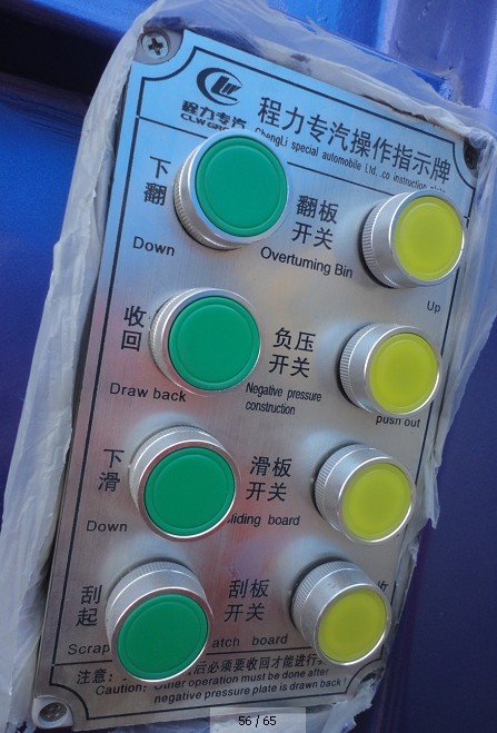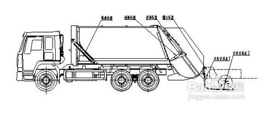 5、壓縮式垃圾車不斷循環操作步驟2-4至所有垃圾裝卸完畢。操縱翻斗到閉合位置,在駕駛室內,踩下離合器。按下取力器開關,使其斷開。開車到下一個垃圾收集點。