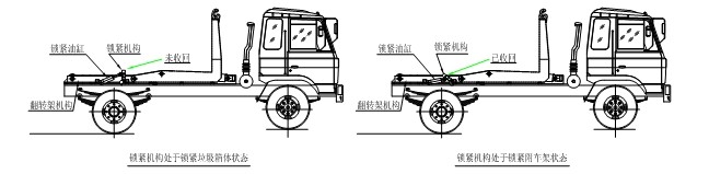 步驟 4.當(dāng)垃圾箱體落放到附車架上后,松開(kāi)拉臂操作手柄使其回到中位,再將鎖緊鉤操作手柄拉起至鎖緊位置,鎖緊油缸伸出,使鎖緊架翻起并將翻轉(zhuǎn)架與垃圾箱體鎖緊固定,松開(kāi)手柄使之回中位;如圖: