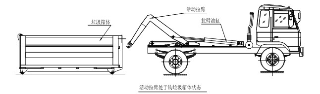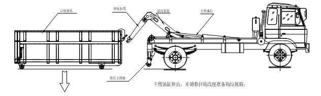 步驟 2.將拉臂操作手柄拉起到伸起位置,拉臂油缸伸出,活動(dòng)拉臂繞翻轉(zhuǎn)翻轉(zhuǎn)架前鉸鏈軸旋轉(zhuǎn),拉臂處于鉤箱位置,適當(dāng)調(diào)整拉臂鉤高度并與箱體彎鉤對(duì)準(zhǔn);如圖:
