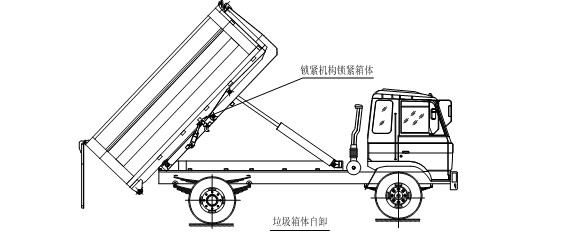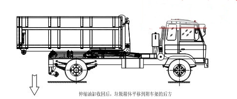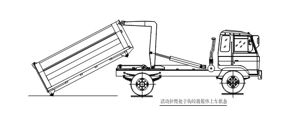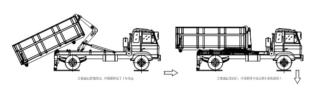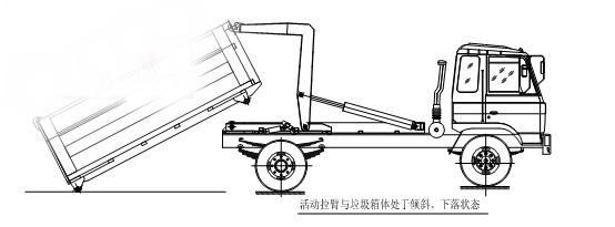 步驟 6.垃圾卸完后,推下拉臂操作手柄至落下位置,垃圾箱體下落到附車架上,松開(kāi)取力器并鎖緊箱體后門,卸垃圾工作完成,整車可以運(yùn)輸行駛。