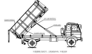 ③ 將主臂油缸操作手柄推至伸出位置,垃圾箱體被緩慢舉起,并形成自卸角,垃圾從箱體內(nèi)滑出自卸,松開(kāi)手柄;如圖: