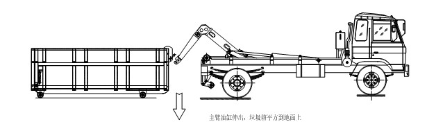 將主臂油缸操作手柄推至伸出位置,主臂油缸伸出,活動(dòng)拉臂旋轉(zhuǎn),帶動(dòng)垃圾箱體慢慢放下車,直至主臂油缸完全伸出回,垃圾箱平放在地面上,松開(kāi)主臂油缸操作手柄使其回到中位;如圖: