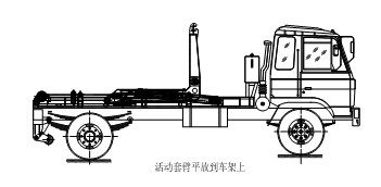 將主臂油缸操作手柄推至收回位置,主臂油缸緩慢收回,活動(dòng)拉臂旋轉(zhuǎn),帶動(dòng)垃圾箱體上車,直至主臂油缸完全收回,垃圾箱平放在附車架的滾輪上,松開(kāi)主臂油缸操作手柄使其回到中位;(注意:保證垃圾箱體的縱梁位于附車架尾部?jī)珊鬂L輪之間);如圖: