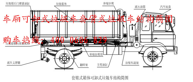 1、套臂式車廂可卸式垃圾車結(jié)構(gòu)簡(jiǎn)圖: