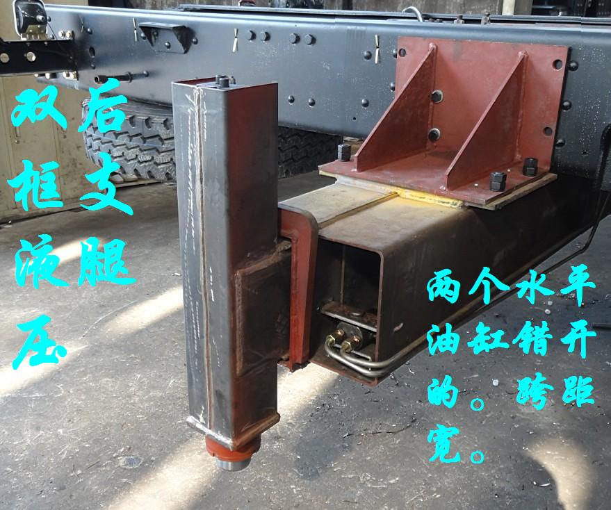 后支腿分固定后支腿和活動后支腿兩種。固定后支腿是油缸直接往下伸的。跨距比較短。活動后支腿是水平方向可以伸出來,然后再往下伸。跨距比較大,比較平穩。