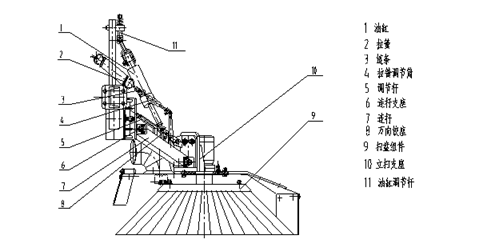 如圖所示,避讓機構由油缸1、調節桿5和連桿7組成。調節桿5和連桿7一端均與固定架鉸接,另一端與掃盤組件9鉸接。掃盤組件9通過調節桿5和連桿7組成的平行四邊形機構來實現上下平移運動,同時通過連桿支座實現水平旋轉運動。油缸1一端鉸接在油缸調節桿11上,另一端鉸接在萬向鉸座8上。掃盤組件9的外伸下降和內收提升動作由油缸1控制。在固定架和連桿7之間設置了拉簧2,拉簧2上端固定在車架上,下端與連桿7相連。利用拉簧的拉力使掃盤組件9保持在預定位置,調節拉簧調節筒4可改變彈簧2拉力的大小。