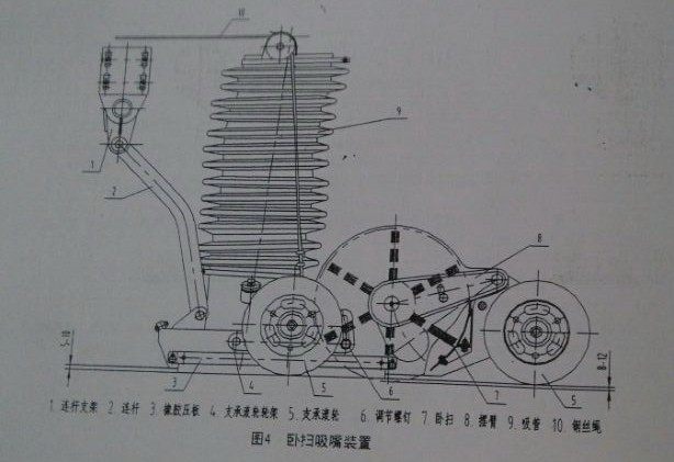 掃盤式,右傾角調(diào)整:松開掃盤傾角調(diào)節(jié)螺栓(圖5序號11),將掃盤外傾2度至4度,然后鎖緊螺母,使其沿聯(lián)接處的滑槽外滑或下旋(加長螺桿下部長度)降低掃盤高度到合適位置,再將鎖緊螺母,其次,再調(diào)節(jié)螺紋筒(圖5序號9),調(diào)節(jié)掃刷接地壓力,使掃刷觸地壓力適當(dāng)。
