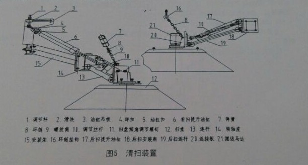 先將后掃提升油缸(圖5序號17)伸到最長,適當(dāng)調(diào)節(jié)環(huán)鏈(圖5序號8)長度并上下調(diào)節(jié)環(huán)鏈掛鉤(圖5序號16),可降低掃盤高度和調(diào)節(jié)掃刷接地壓力。