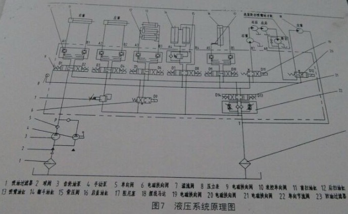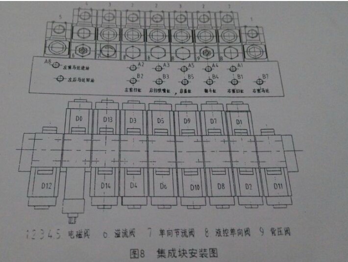 液壓系統(tǒng):液壓系統(tǒng)由液壓泵,液壓馬達(dá),液壓缸,溢流閥,節(jié)流閥,液控單向閥,背壓閥,集成塊,手動(dòng)泵,液壓油箱,連接油管等組成,其原理見圖7(圖7小雙點(diǎn)劃線方框內(nèi)選裝臥掃吸嘴時(shí)增加的元件),集成塊安裝見圖8。